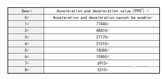 如下圖圖示,42mm兩相混合式步進電機系列系統(tǒng)總線中小型步進電機控制器的加加減速機時間分八個級別,各自相匹配1-8的加降速指數(shù),標值越倍加減速時間越長