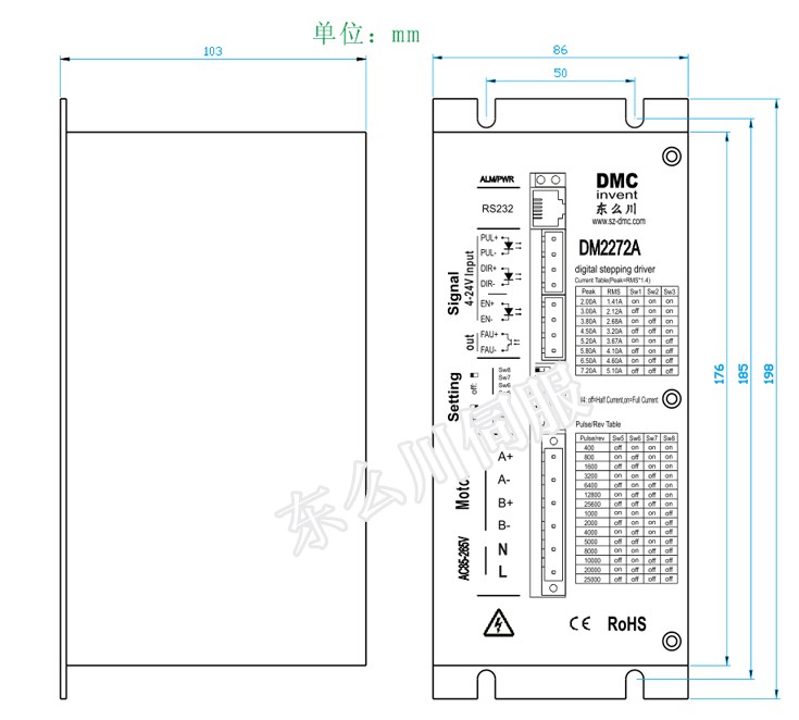 高壓兩相步進電機驅動器DM2272A是基于DSP控制的高壓兩相步進電機驅動器。它是將先進的DSP控制芯片和兩相逆變驅動模塊結合一起所構成的新一代數字步進電機驅動器。驅動電壓為AC85V-220V,適配電流在7.2A以下、外徑86-130mm的各種型號的兩相混合式步進電機。該驅動器內部采用類似伺服控制原理的電路,此電路可以使電機運行平穩,由于采用了平滑技術,低速時幾乎沒有震動和噪音,電機在高速時,仍保持較大的力矩。定位精度最高可達25600步/轉。