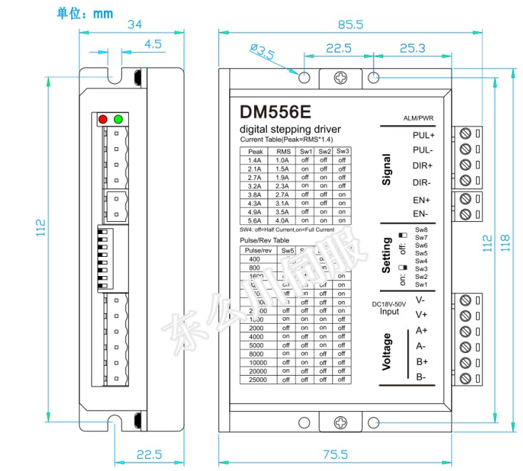 DM556E/DM756A型驅動器 具有更低的電機發熱、運行噪聲和更高的平穩性,以及更低的成本,主要驅動57,86型兩相混合式步進電機。其微步細分數有15種,最大步數為25000Pulse/rev;其工作峰值電流范圍為1.4A-5.6A,輸出電流共有8檔,電流的分辨率約為0.6A;具有自動半流,過壓和過流保護等功能。本驅動器為直流供電,建議工作電壓范圍為24VDC-50VDC,電壓不超過70VDC,不低于20VDC。