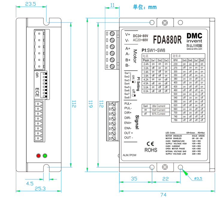FD880R產(chǎn)品是東么川公司采用先進(jìn)的DSP控制芯片與獨(dú)特的控制電路結(jié)合 一起所構(gòu)成的新一代智能數(shù)字式細(xì)分型步進(jìn)電機(jī)驅(qū)動(dòng)器,基于精密的PID電流控制算法設(shè)計(jì),高速大力矩輸出,靜止時(shí)動(dòng)態(tài)電流自動(dòng)減半,使電機(jī)溫升大為降低,最大限度發(fā)揮電機(jī)的性能,用戶可以設(shè)置1—12細(xì)分,低中,高速運(yùn)行都非常平穩(wěn),幾乎沒有振動(dòng)和噪音,安全解決了步進(jìn)電機(jī)低速振動(dòng)和噪音的缺陷,驅(qū)動(dòng)器內(nèi)部集成了參數(shù)自動(dòng)調(diào)整功能,能針對(duì)不同參數(shù)電機(jī)自動(dòng)生成最優(yōu)的運(yùn)行參數(shù)。